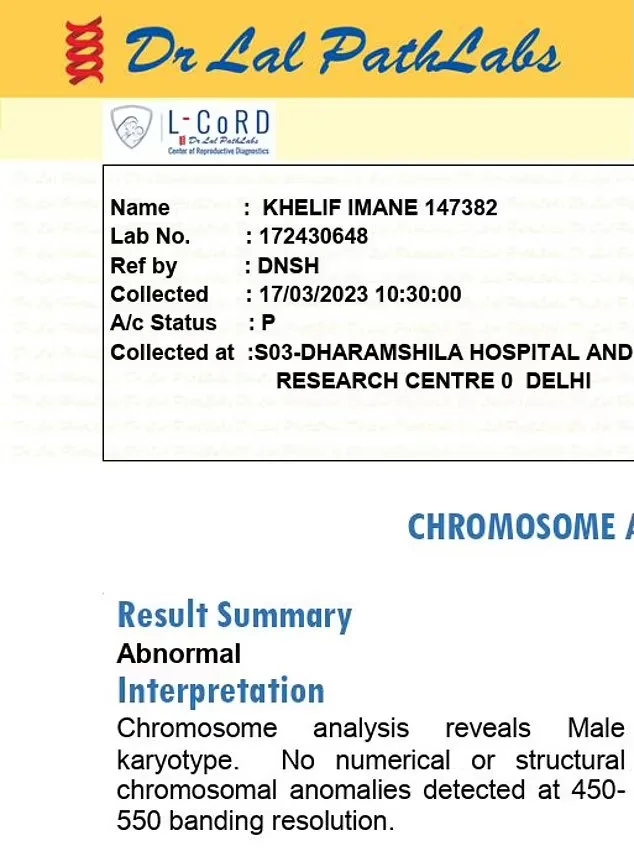 «Η ανάλυση χρωμοσωμάτων αποκαλύπτει ανδρικό καρυότυπο», αναφέρεται στο έγγραφο που φέρονται να είδαν οι 3 Wire Sports μέσω της Telegraph Sport. Τα αποτελέσματα φέρουν ημερομηνία συλλογής την 17η Μαρτίου 2023 – την ίδια χρονιά που η Κελίφ αποκλείστηκε από τη Διεθνή Ομοσπονδία Πυγμαχίας (IBA), την πρώην διοικούσα αρχή του αθλήματος, λόγω φερόμενης αποτυχίας στα τεστ επιλεξιμότητας φύλου.